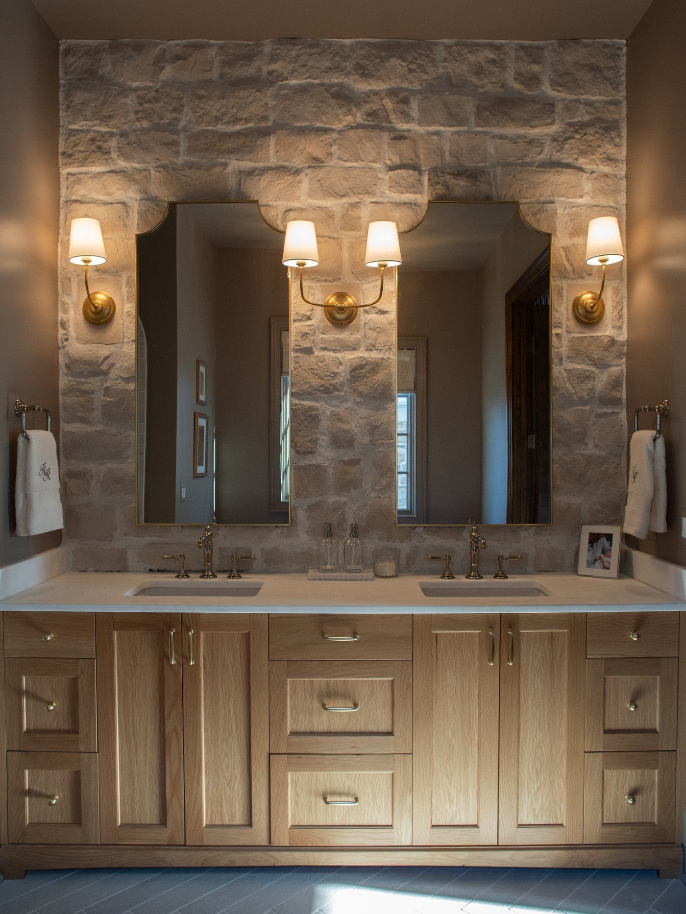 View ProjectEvening Ritual is the kind of bathroom that slows you down the moment you step inside. The space feels calm and grounding, with warm white oak cabinetry and a stone accent wall that adds quiet texture and depth. Marble surfaces catch the light just enough, the clawfoot tub invites lingering, and a soft glow from the chandelier makes even ordinary routines feel intentional. It’s a room designed for unwinding, where the day fades away and evenings feel unhurried.
