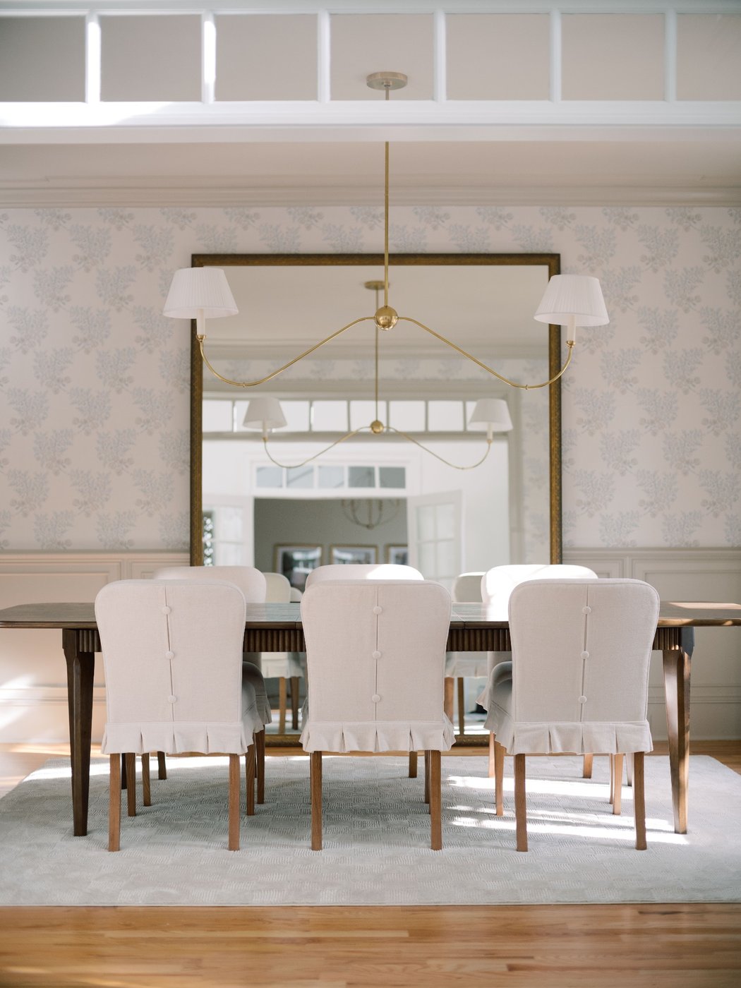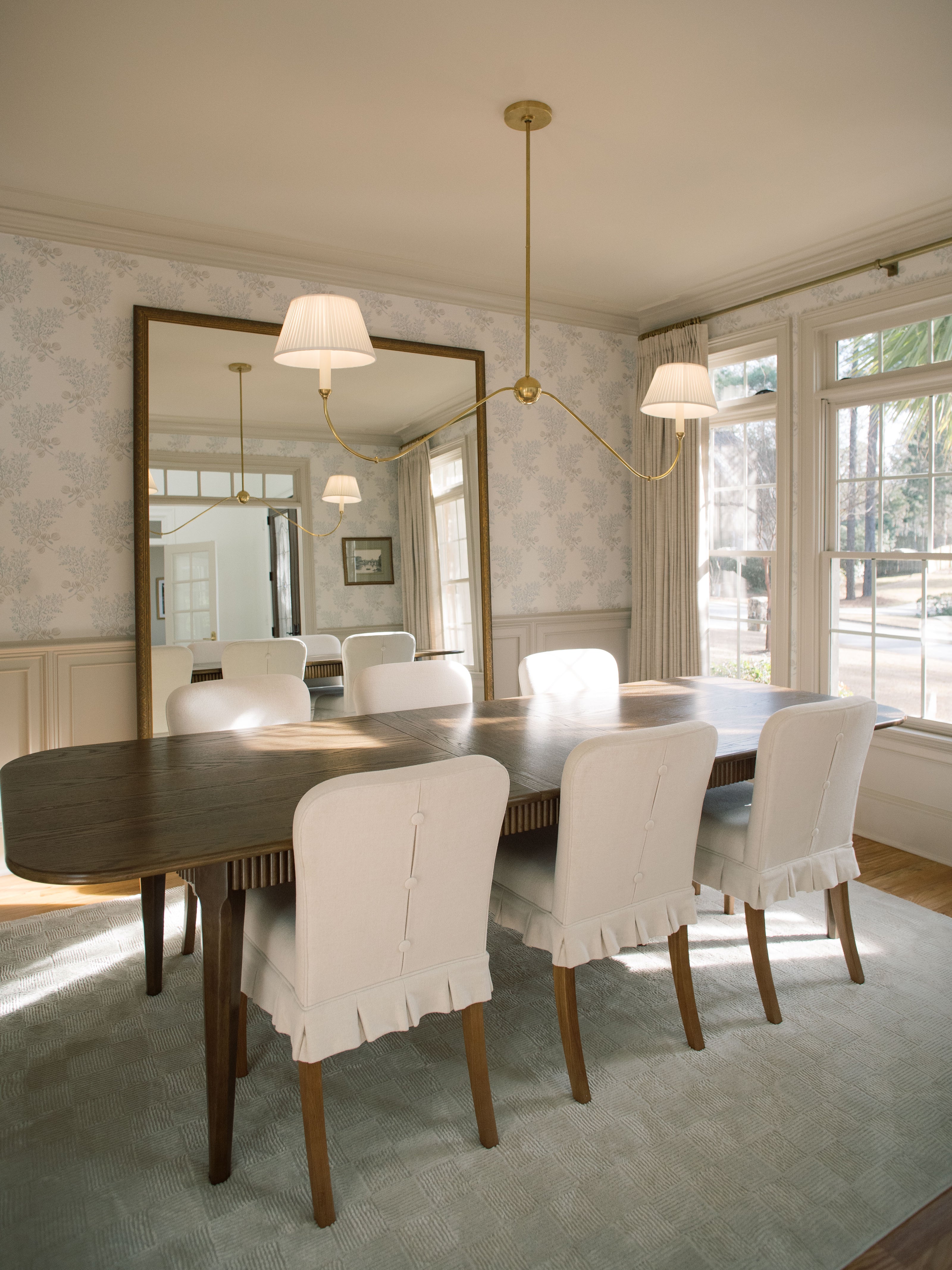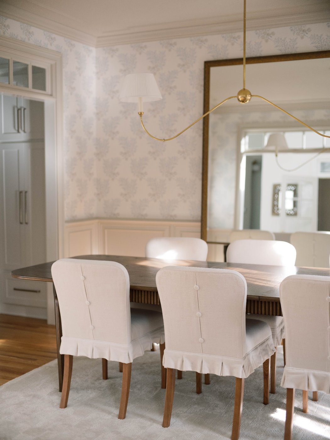 This dining room balances charm with intention, creating a space that feels thoughtful, timeless, and inviting. Soft patterned walls and classic millwork set a refined foundation, allowing the furnishings to feel curated without overwhelming the room. The wooden dining table anchors the space for both everyday meals and meaningful gatherings, while upholstered chairs with subtle button detailing introduce a quiet moment of personality. A custom oversized mirror, measuring 8' by 6', spans the wall and reflects light beautifully throughout the day, bringing scale, openness, and a quiet sense of drama to the room. The result is a dining space that feels polished yet comfortable, designed for connection, conversation, and lingering moments.