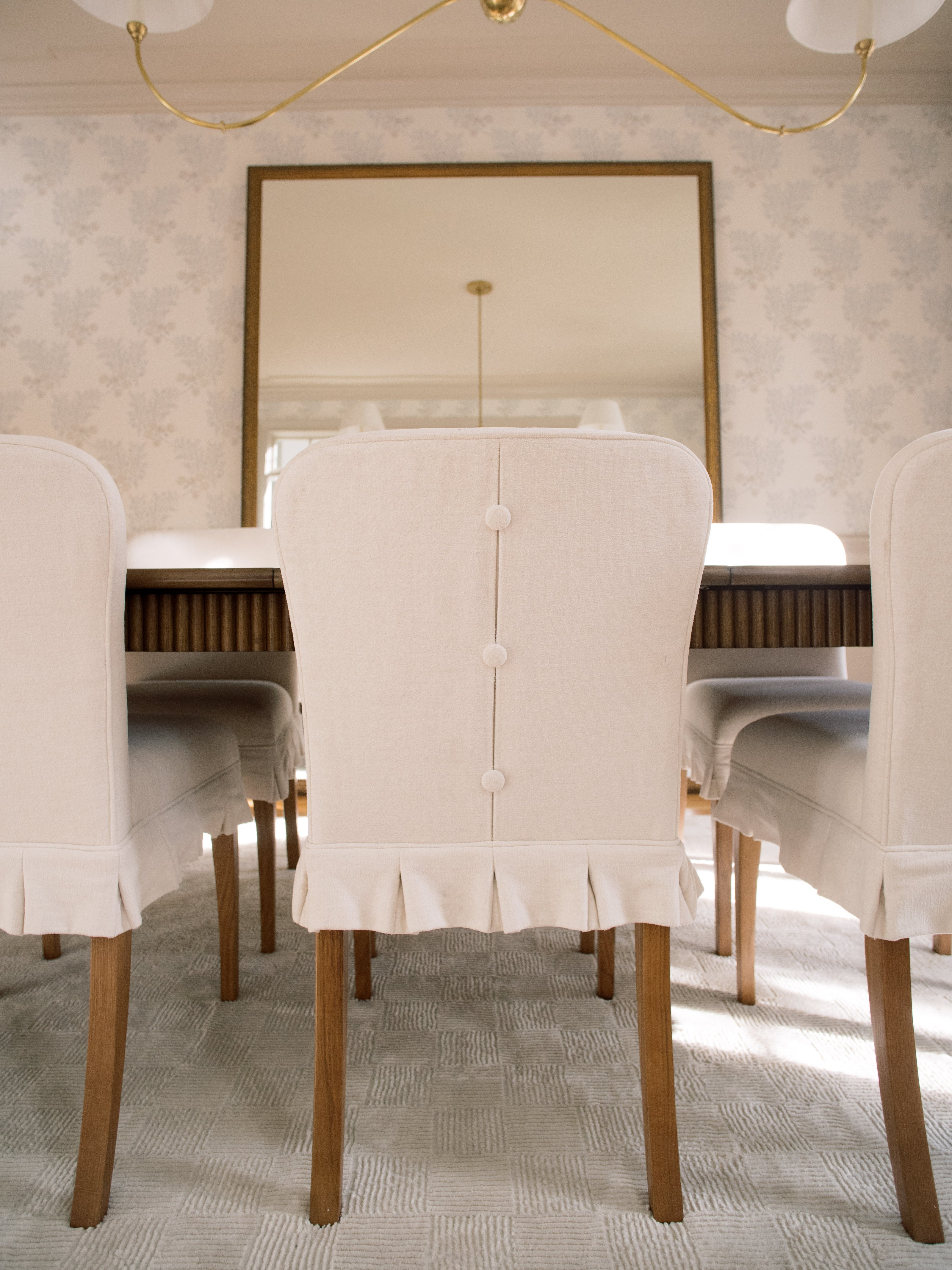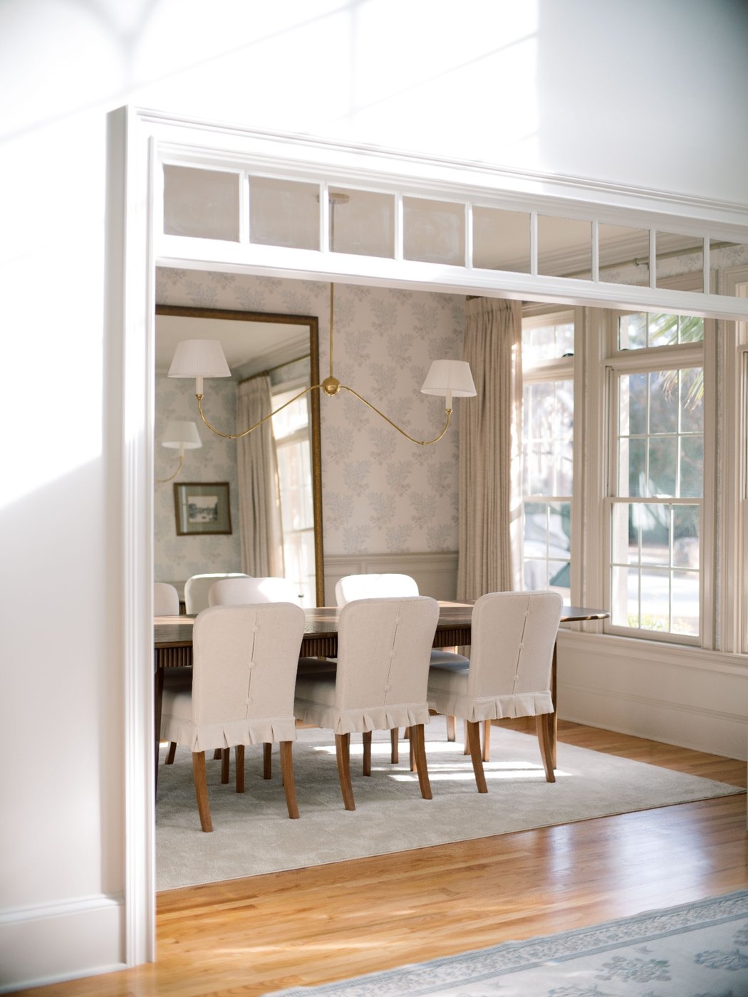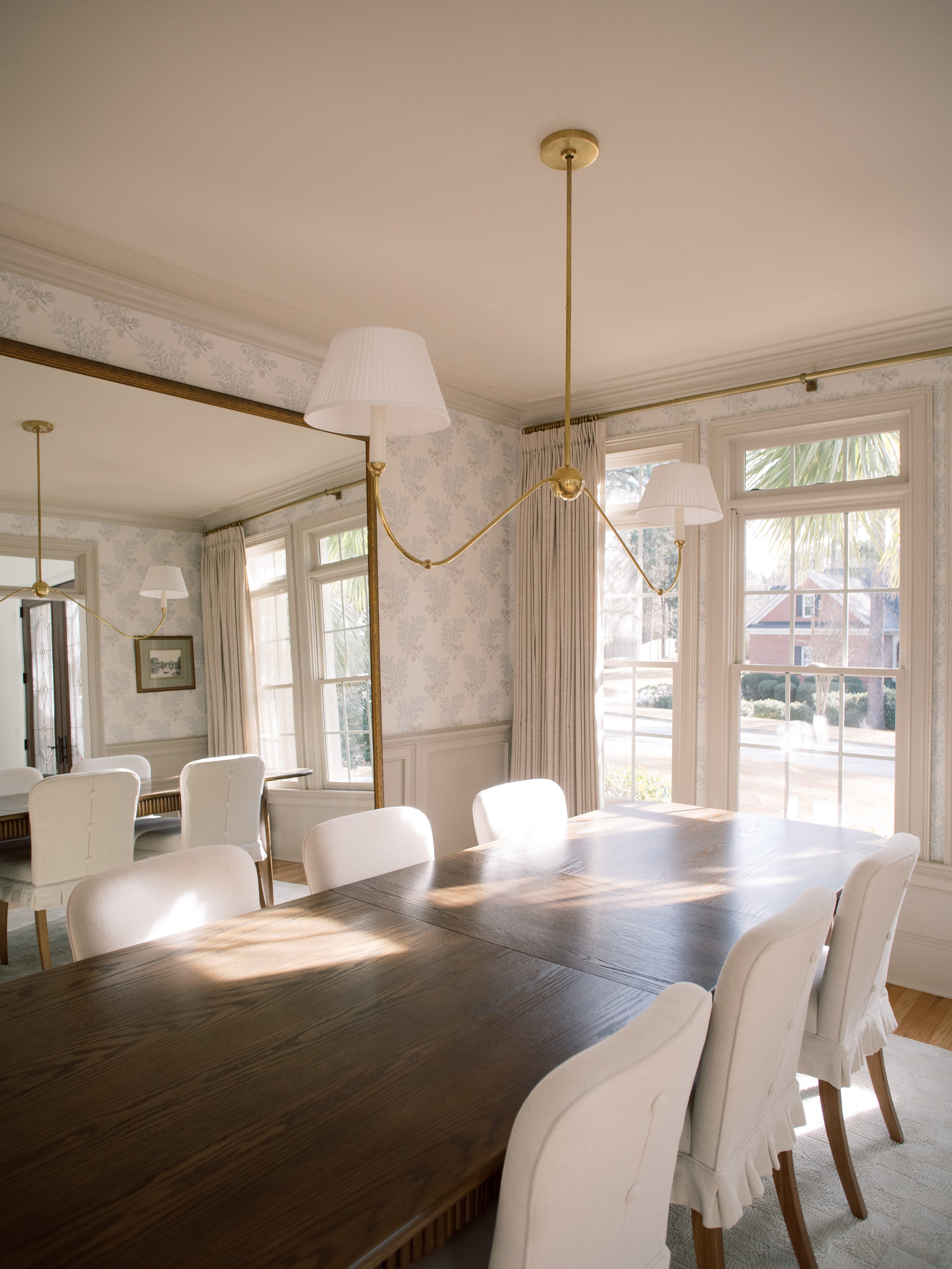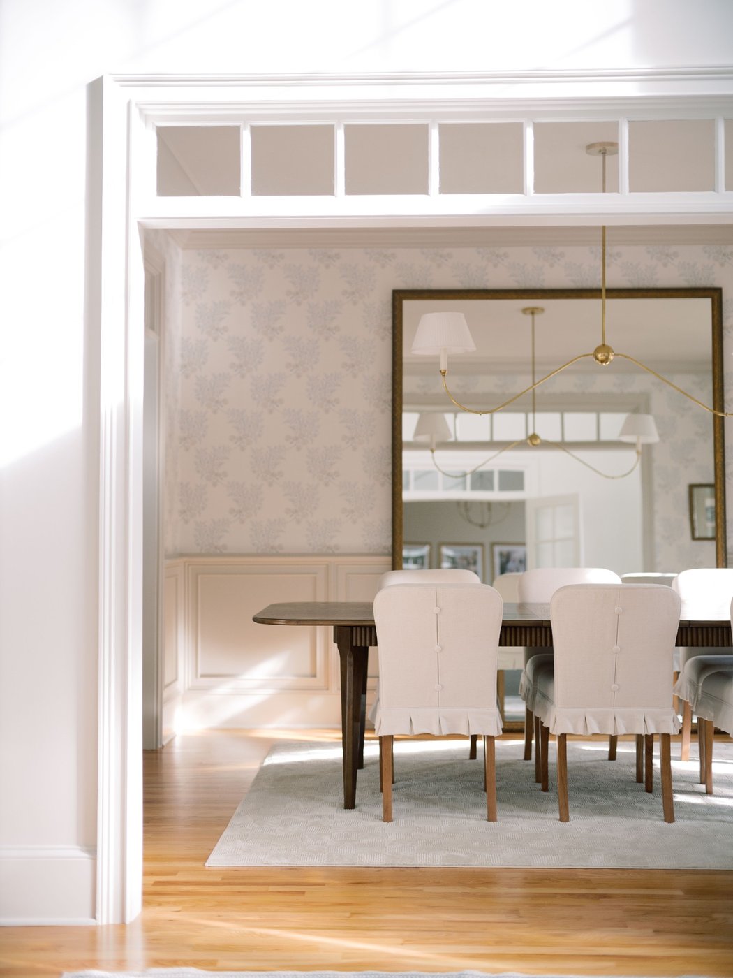 This dining room balances charm with intention, creating a space that feels thoughtful, timeless, and inviting. Soft patterned walls and classic millwork set a refined foundation, allowing the furnishings to feel curated without overwhelming the room. The wooden dining table anchors the space for both everyday meals and meaningful gatherings, while upholstered chairs with subtle button detailing introduce a quiet moment of personality. A custom oversized mirror, measuring 8' by 6', spans the wall and reflects light beautifully throughout the day, bringing scale, openness, and a quiet sense of drama to the room. The result is a dining space that feels polished yet comfortable, designed for connection, conversation, and lingering moments.